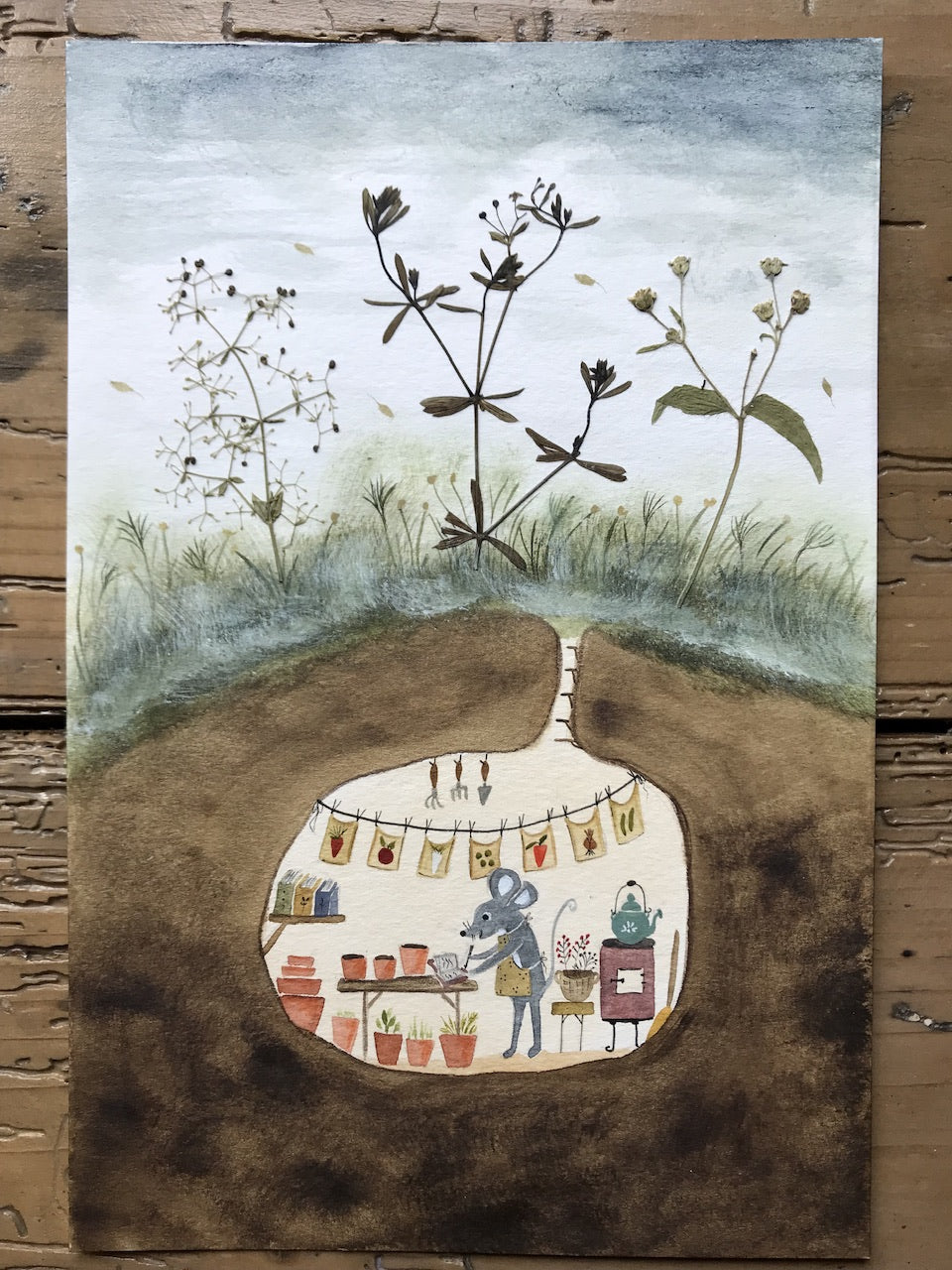 Original watercolour painting with pressed plant collage painted on cold pressed watercolour paper 300g/m.