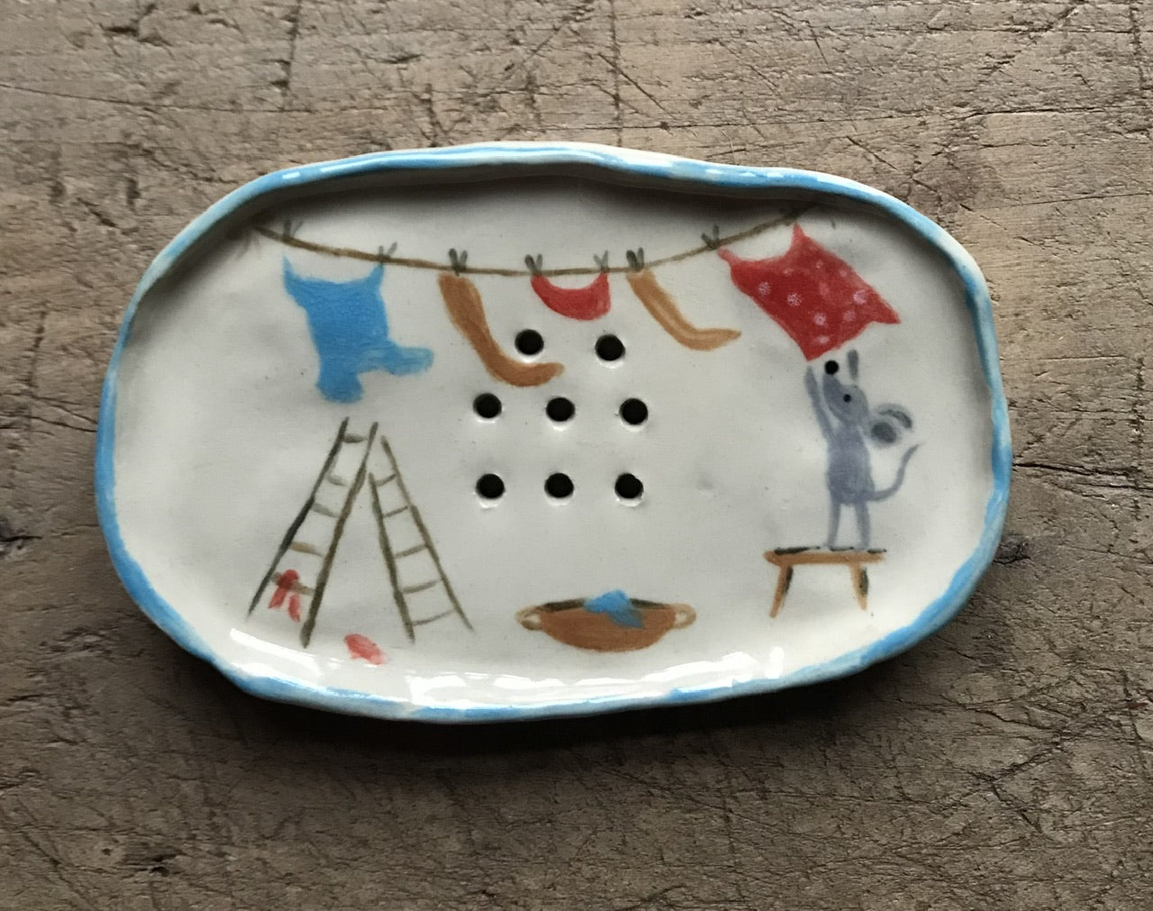 Handmade and handpainted clay item.