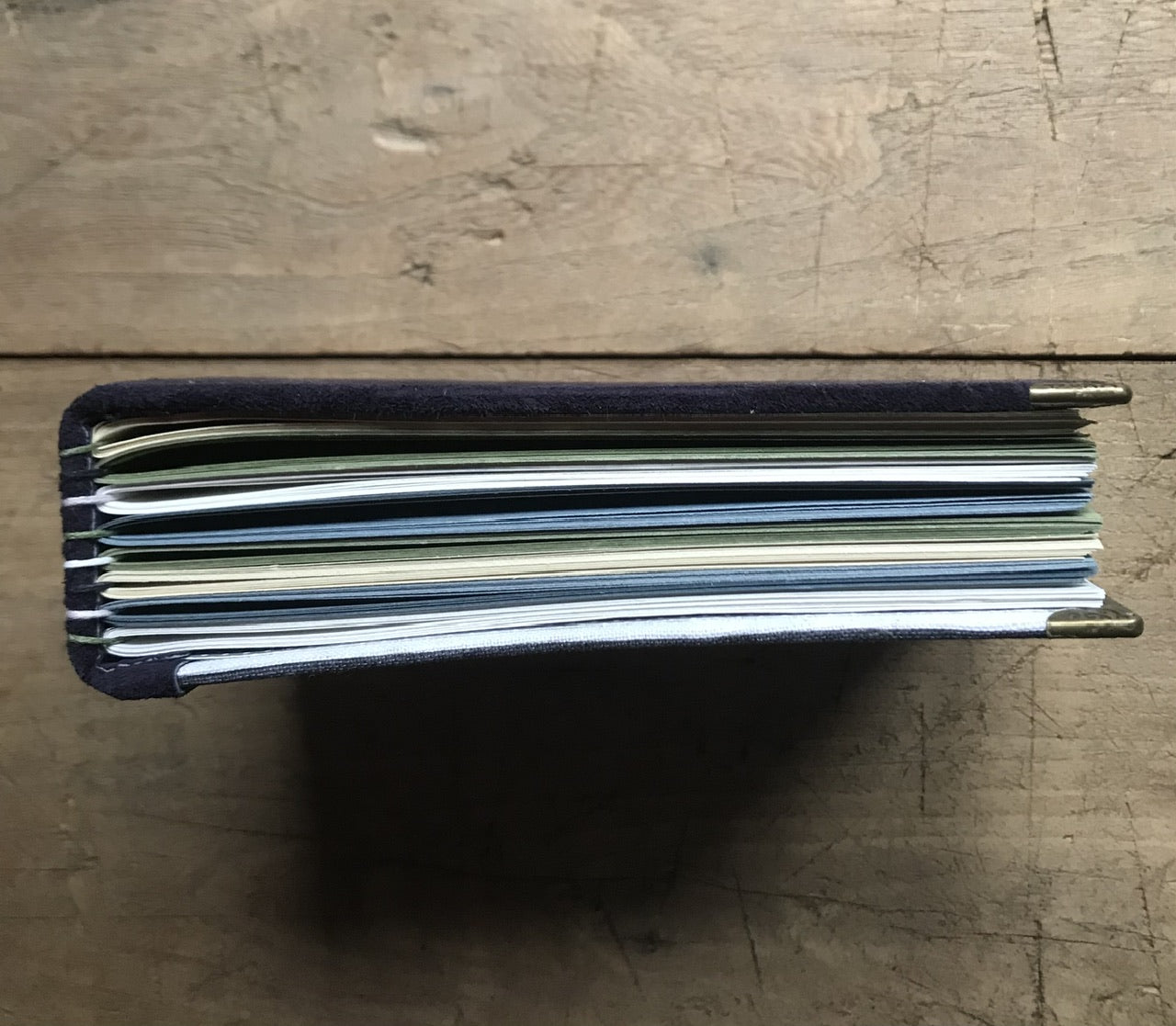 • inside over 100 pages (200+ sides) of white paper in different type and different weight, there are white blank pages and lined pages divided into sections which are divided by colourful pages